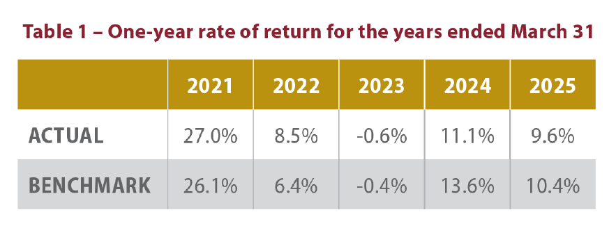 The endowment funds have a long-term horizon, so investment performance is evaluated over a multi-year period. The following table shows the Endowment Fund one-year rates of return net of investment management fees as compared to benchmark returns from 2021 to 2025.