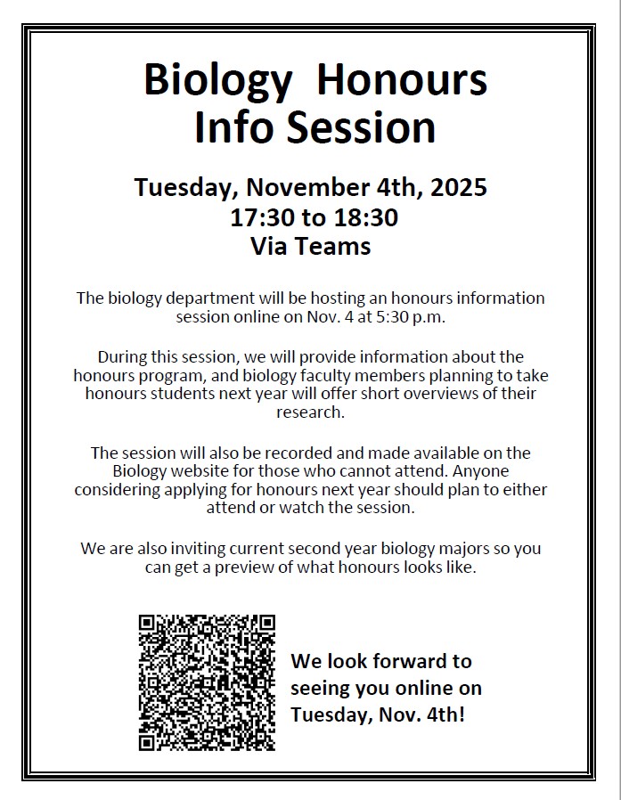 The biology department will be hosting an Honours information session online on Nov. 4, 2025 at 5:30 p.m. Faculty members briefly will discuss their research and the types of projects they are considering for next year. If you want to attend the session, click in this link: Honours Info Session 2025 . A recorded presentation will be uploaded after it.