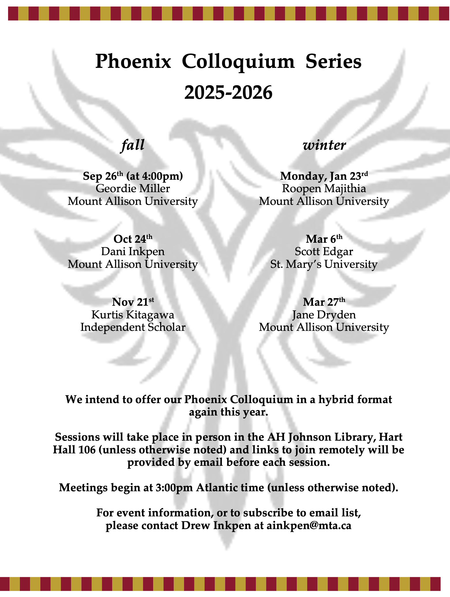 There’ll be two changes this year. Except for our first colloquium, we will start earlier than in previous years, at 3:00pm. We will also move back to the AH Johnson Library on the first floor of Hart Hall, HH 106. We will again run the Phoenix in a hybrid format. Contact Dr. Inkpen to join the email list.