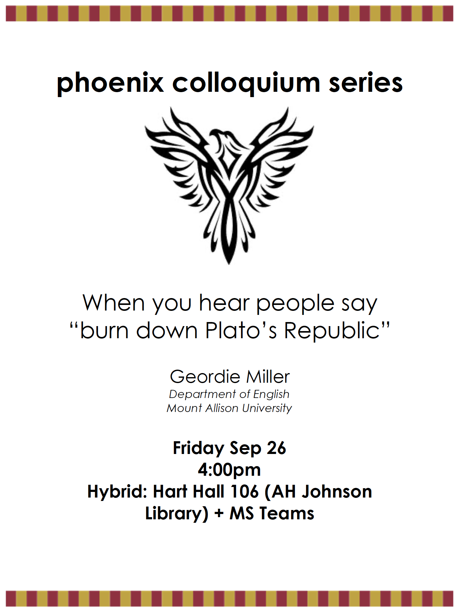 Please join us this Friday (Sept 26) at 4:00pm in the AH Johnson Library (Hart Hall 106) for our first Phoenix Colloquium of the year! Dr. Geordie Miller (MtA, English) will give us a talk titled, “When you hear people say ‘burn down Plato’s Republic’.” You can find a short abstract below. I’ve also attached a poster. The Phoenix will be hybrid again this year, and you can request MS Teams link by sending an email to Dr. Inkpen