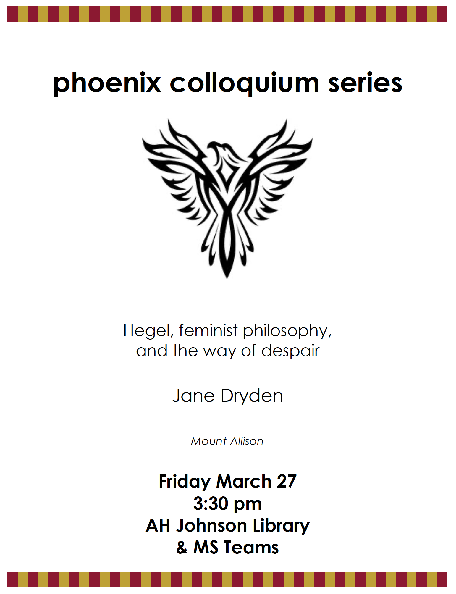 Dr. Dryden's Phoenix will also be accessible through MS Teams. Email rmoser@mta.ca for the link.