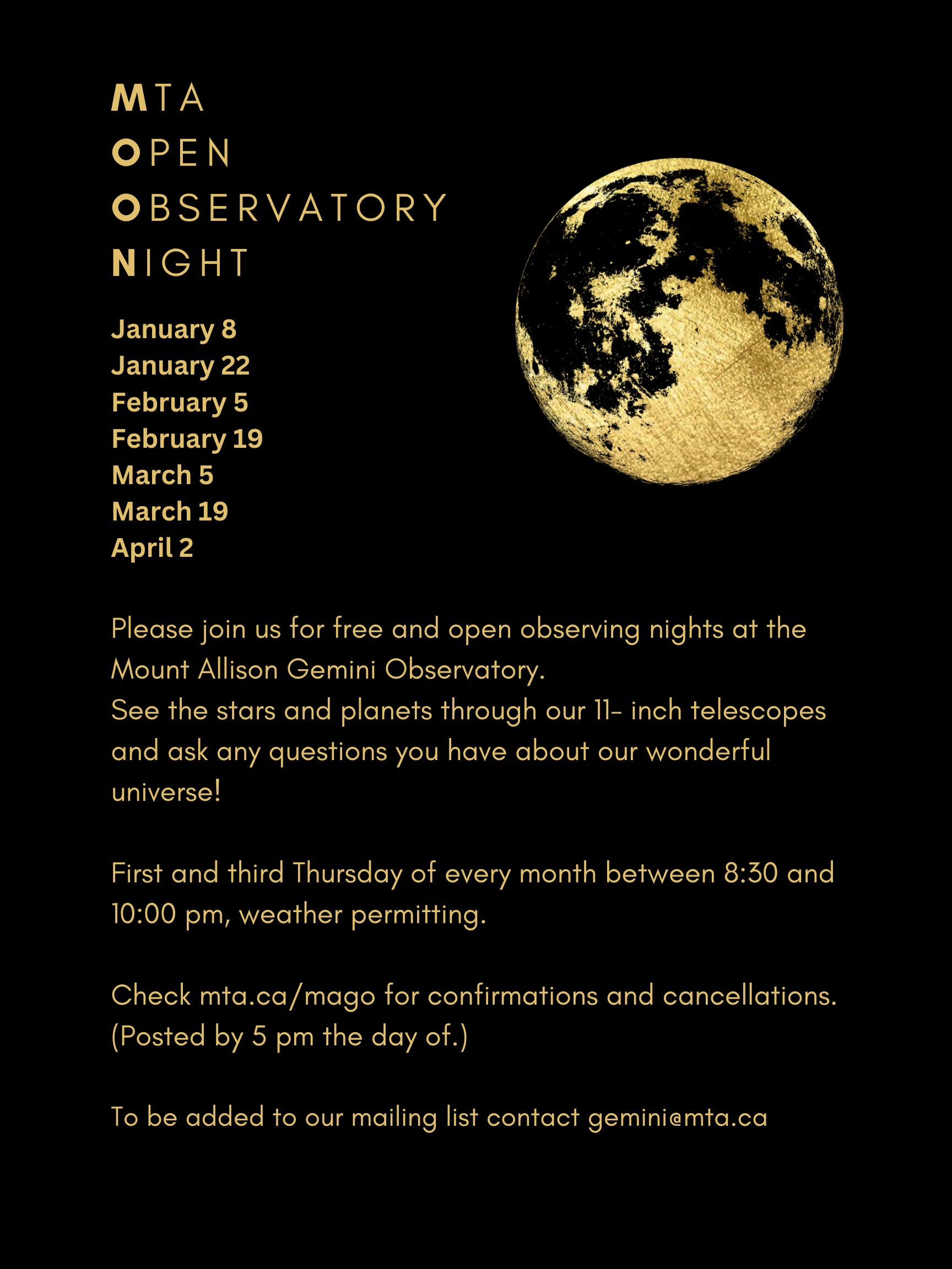 If you want to be added to our e-mail address list, so that you are informed of our upcoming events, please e-mail gemini@mta.ca and ask to be added to our contact list.