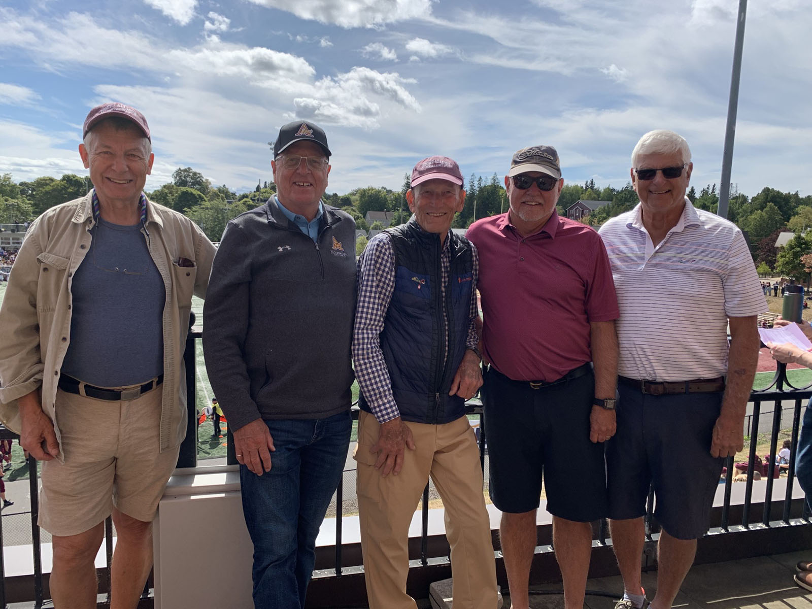 Classmates and friends reconnect at this year’s Homecoming game. (L–R) Mark Johnson (’71), Paul Christie (‘68, ‘69), Owen MacCausland (’71), Bill Bishop (’70), and Lorne Goodman (’70).