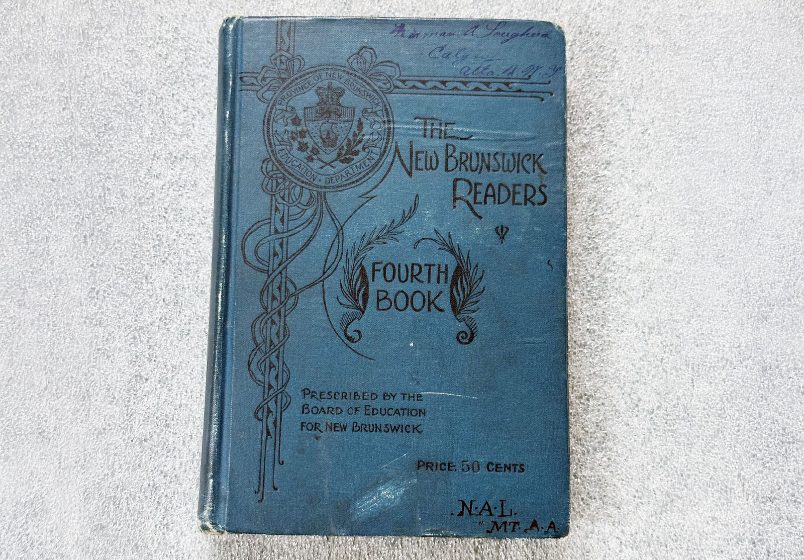 It began when I got a position at Lougheed House in 2023 as their programming summer student. When doing some collections work, I saw a book titled New Brunswick Readers, The Fourth Reader within the Lougheed family collection. Inside, a handwritten description took me by surprise.